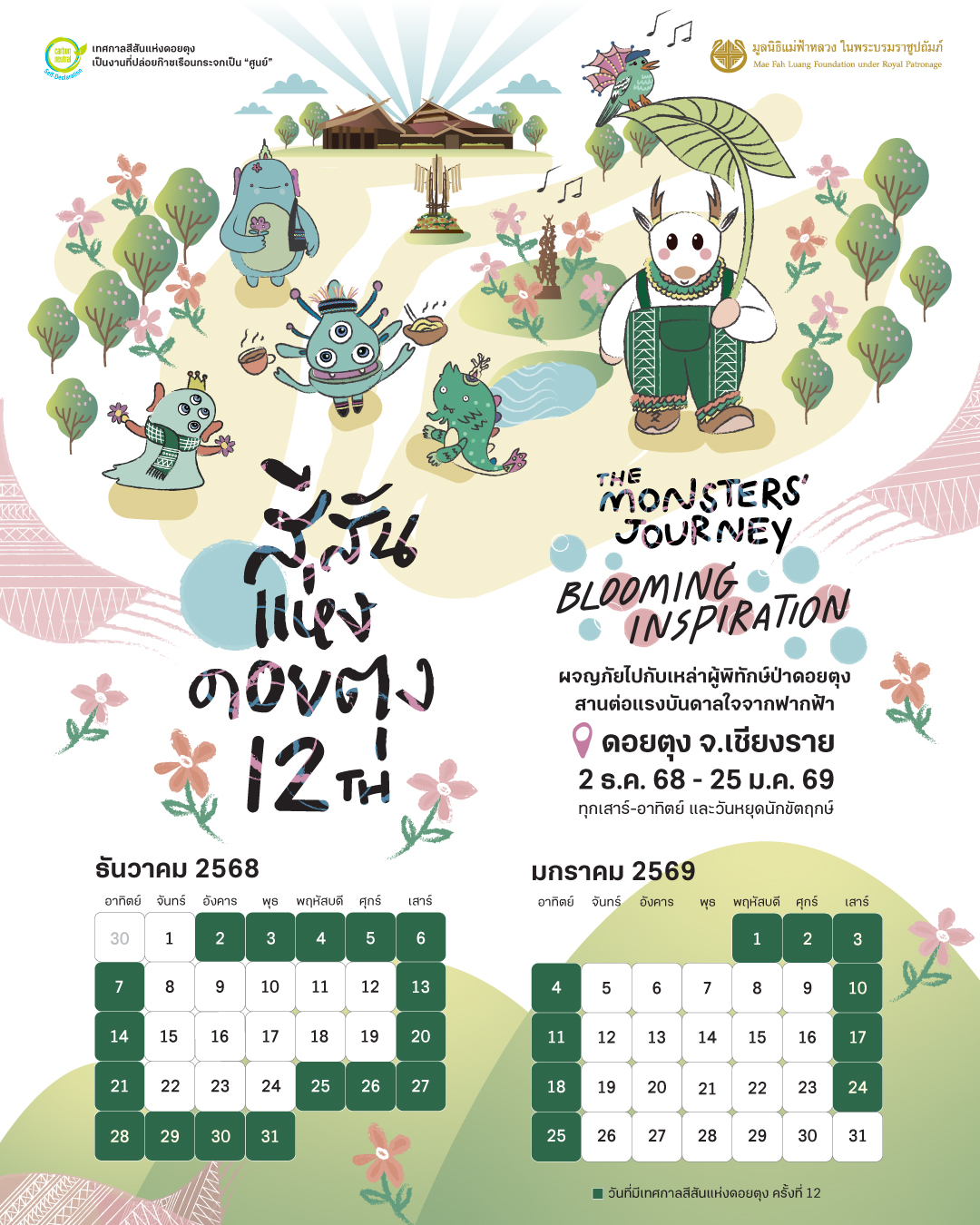 Normally, the annual ‘Colors of Doi Tung’ Festival is held every Saturday, Sunday, and public holiday from 08:00 to 18:00 hrs. in Doi Tung, Chiang Rai throughout the 2 months of December and January (December 2, 2025 - January 25, 2026). This event is held every year to celebrate the success of the Doi Tung Development Project with art, local handicrafts and northern delicacies.