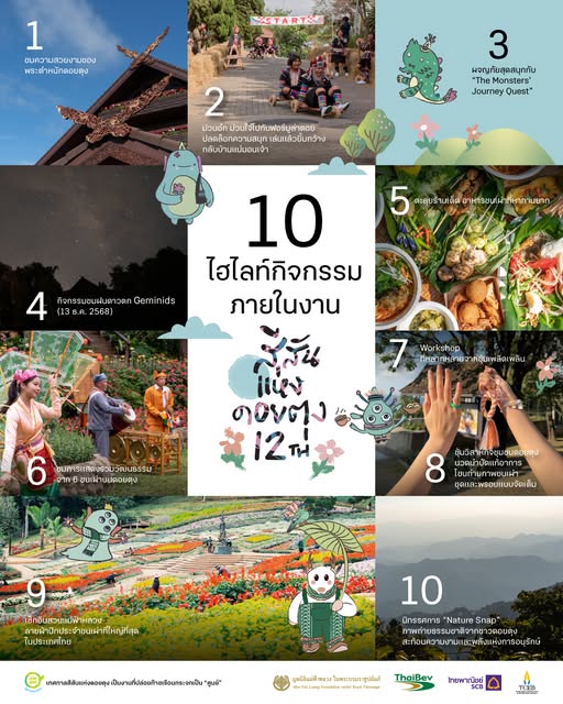 Leading the festival is P’To, a character inspired by the traditional Tai Yai “Rumnok-Rumto” dance. He represents biodiversity and the unique natural guardians of Doi Tung. Beside him are four charming characters known as the Marn Marn Guardians from Chiang Saen, who combine cuteness with local wisdom and environmental awareness. Visitors will meet these characters along the walking street and throughout the festival grounds.